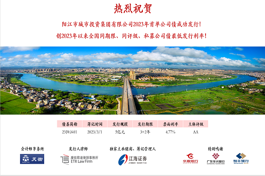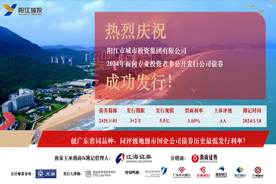 2024年1月19日,市城投集團(tuán)在深圳證券交易所成功發(fā)行“陽(yáng)江市城市投資集團(tuán)有限公司2024年面向?qū)I(yè)投資者非公開發(fā)行公司債券”。本期債券發(fā)行規(guī)模為5.5億元,期限為5(3+2)年,票面利率3.10%,全場(chǎng)認(rèn)購(gòu)倍數(shù)超過4.8倍,是...