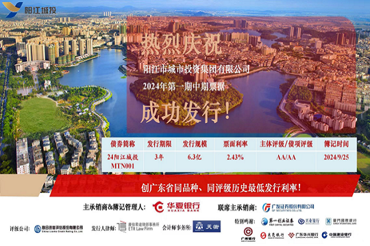 2024年9月26日,市城投集團(tuán)在中國(guó)銀行間交易商協(xié)會(huì)成功發(fā)行“陽(yáng)江市城市投資集團(tuán)有限公司2024年第一期中期票據(jù)”。本期債券發(fā)行規(guī)模為6.3億元,期限為3年,票面利率2.43%,全場(chǎng)倍數(shù)超過2.52倍。本期債券創(chuàng)下了廣東省同...